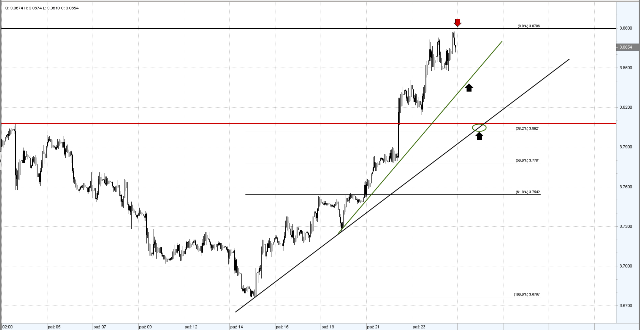 W wyniku odbicia górne ograniczenie średnioterminowego trendu bocznego budującego się od maja br. (3,8540). Sforsowanie tego oporu jest technicznym sygnałem realizacji scenariusza wzrostowego w perspektywie najbliższych tygodni i otwiera drogę do ataku poziomu tegorocznych ekstremów (3,96).